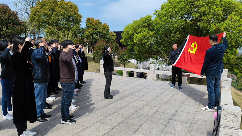 在新四軍太湖游擊隊紀(jì)念館的五人英雄石雕像前,新安黨支部的黨員們迎著春風(fēng),面對黨旗再次重溫入黨誓詞,擲地有聲鄭重宣誓。